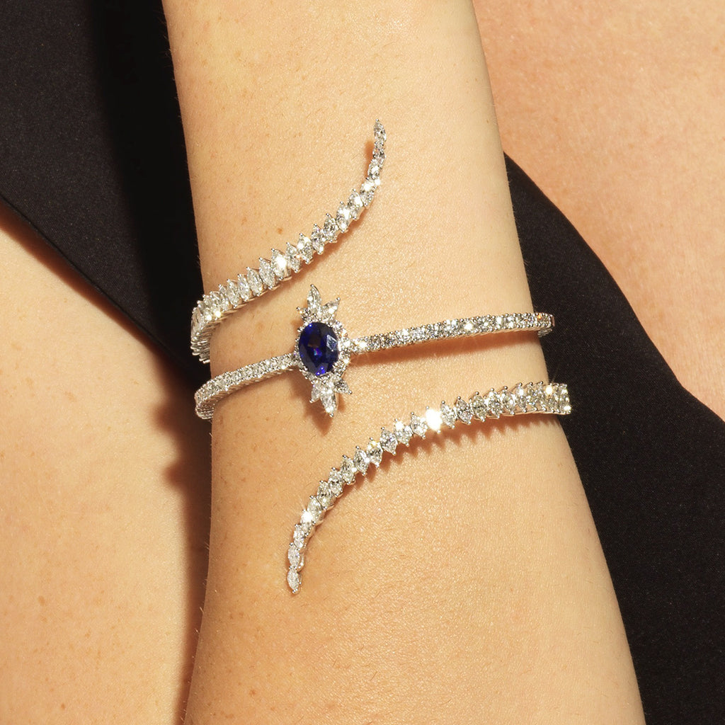YEPREM bracelet adorned with a combination of round and marquise diamonds boasting exceptional clarity of VVS and VS, as well as a striking F-G color, accentuating the sapphire stone.