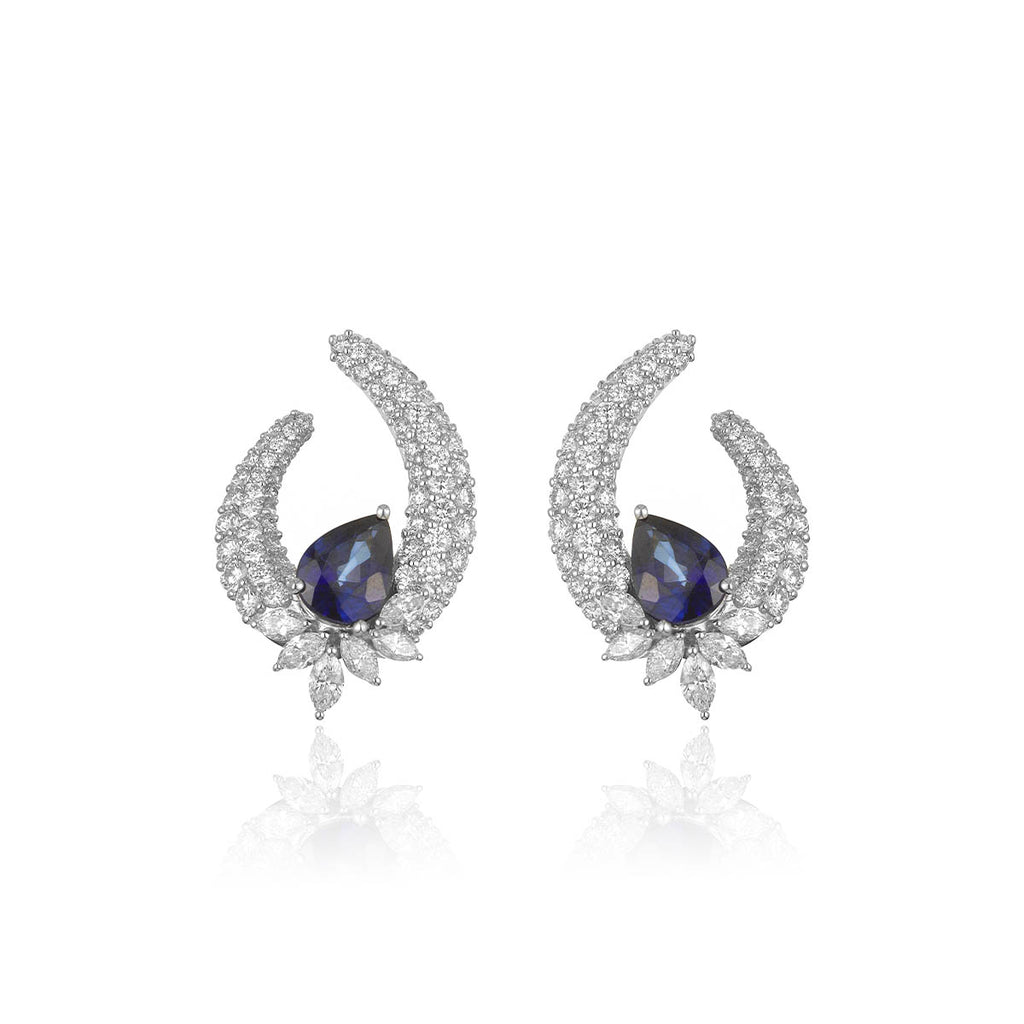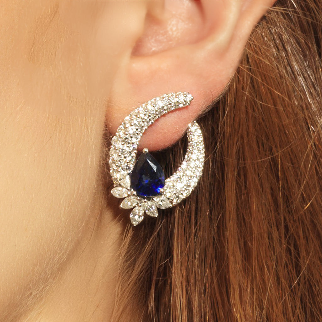 YEPREM drop earrings adorned with a combination of round and marquise diamonds, boasting exceptional clarity of VVS and VS, as well as a striking F-G color, accentuating the sapphire stone.