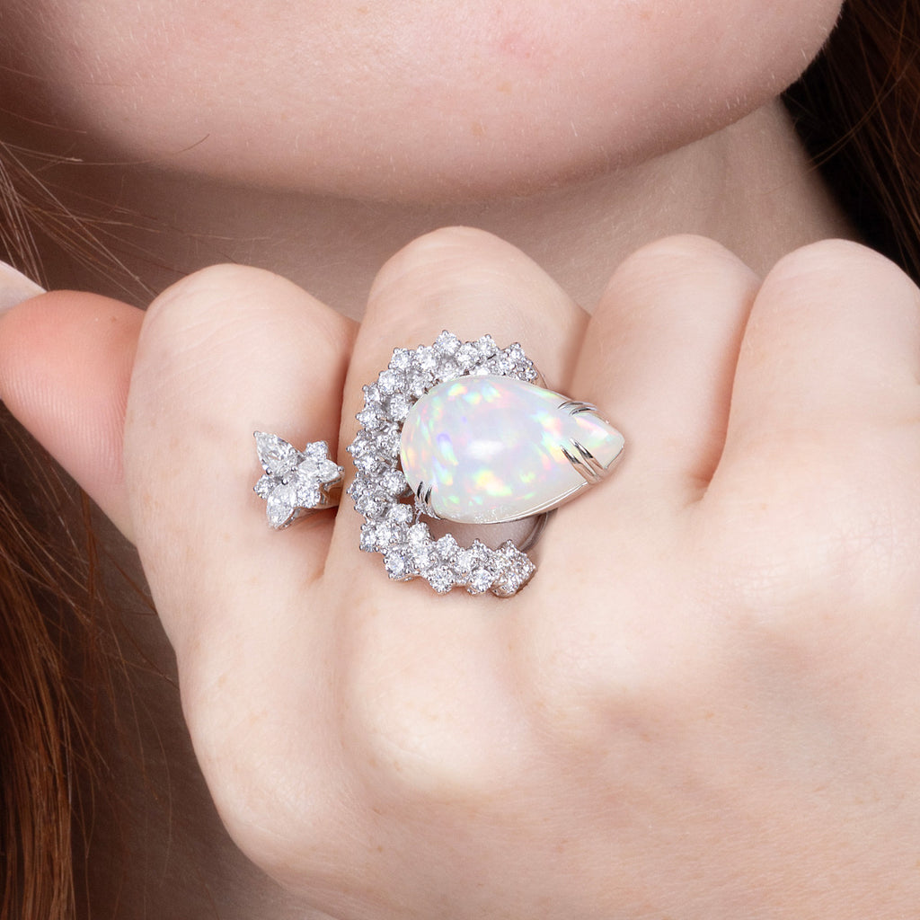 YEPREM stackable ring adorned with a combination of round, pear and marquise diamonds boasting exceptional clarity of VVS and VS, as well as a striking F-G color, perfectly accentuating the opal stone.