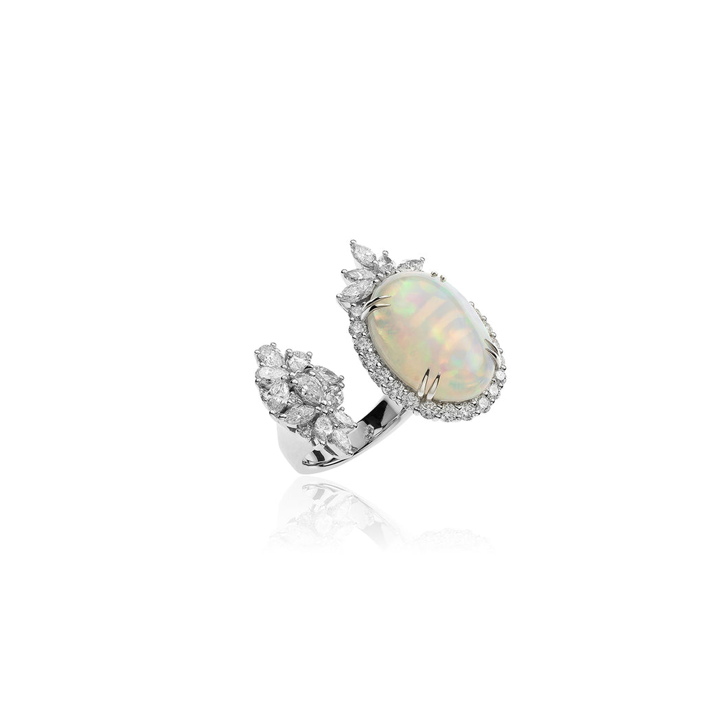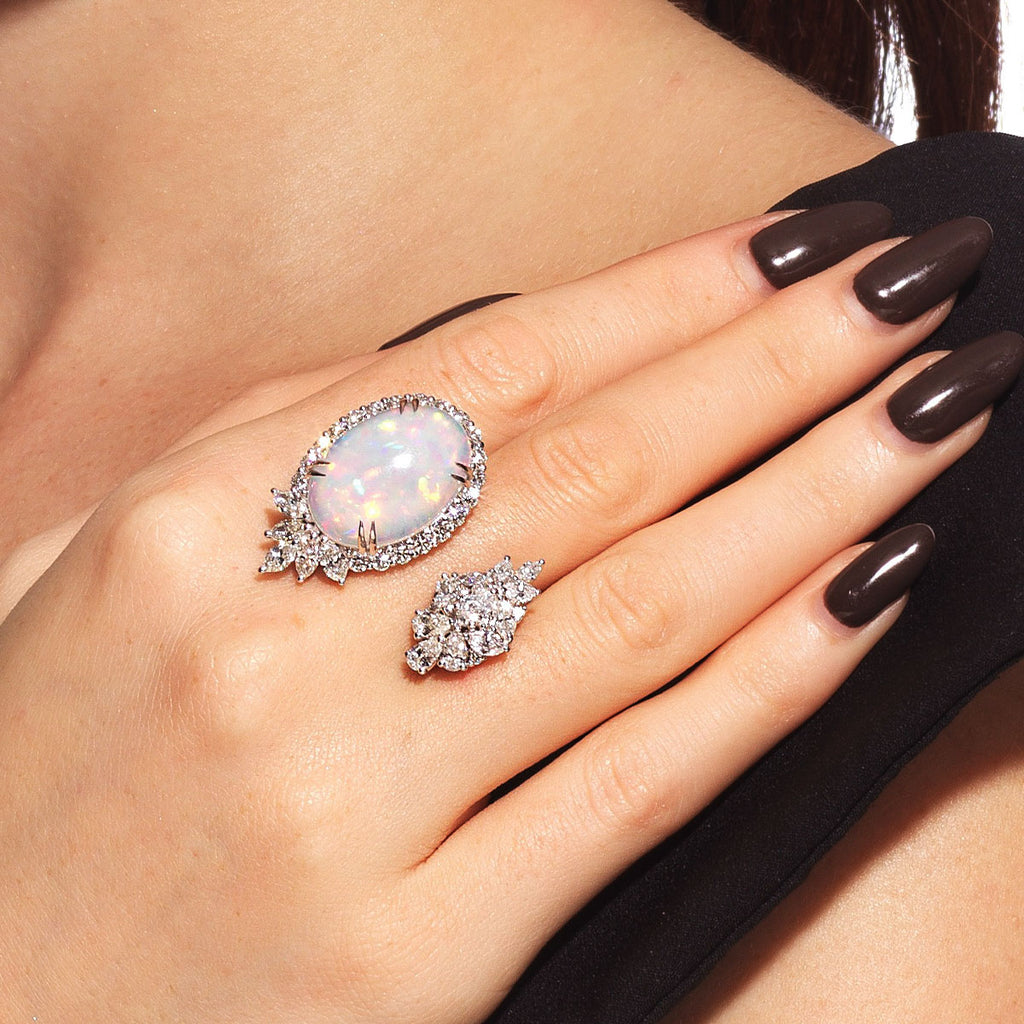 YEPREM stackable ring adorned with round, pear and marquise diamonds. These diamonds boast a remarkable clarity of VVS VS and F G color, perfectly accentuating the opal stones.