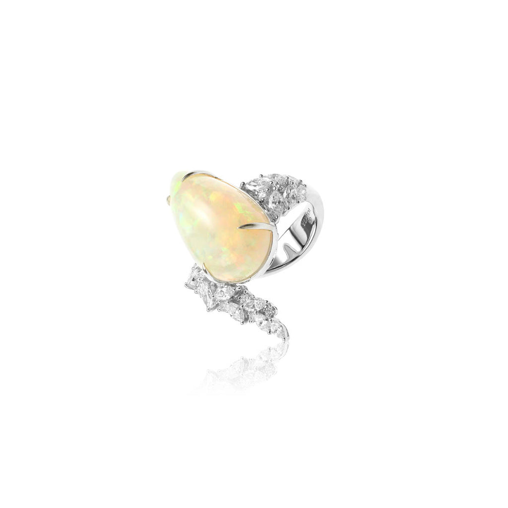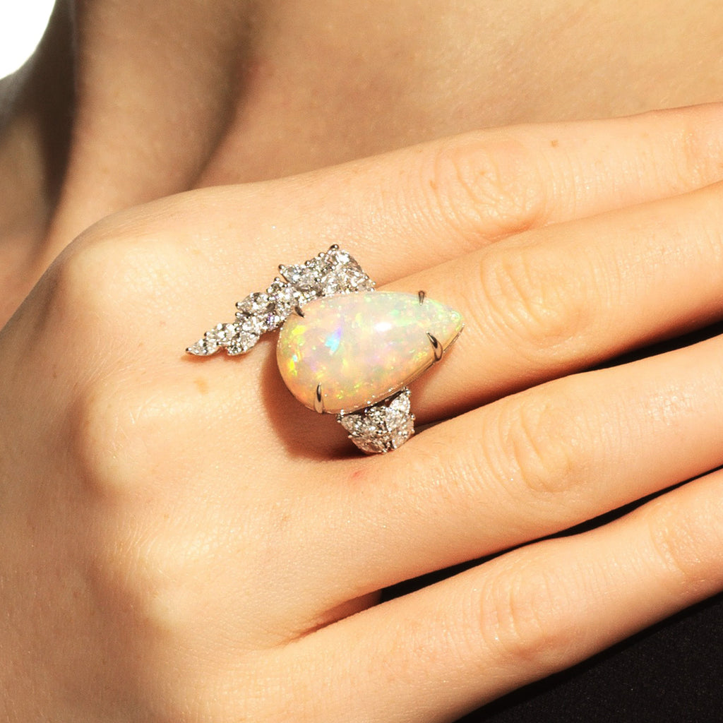 YEPREM stackable ring adorned with round and marquise diamonds. These diamonds boast a remarkable clarity of VVS VS and F G color, perfectly accentuating the opal stones.
