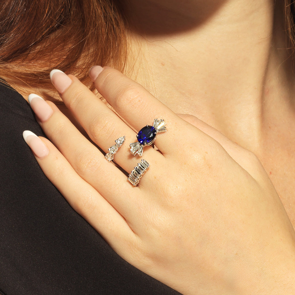 YEPREM stackable ring adorned with a combination of baguette, pear and tappers diamonds boasting exceptional clarity of VVS and VS, as well as a striking F-G color, accentuating the sapphire stone.