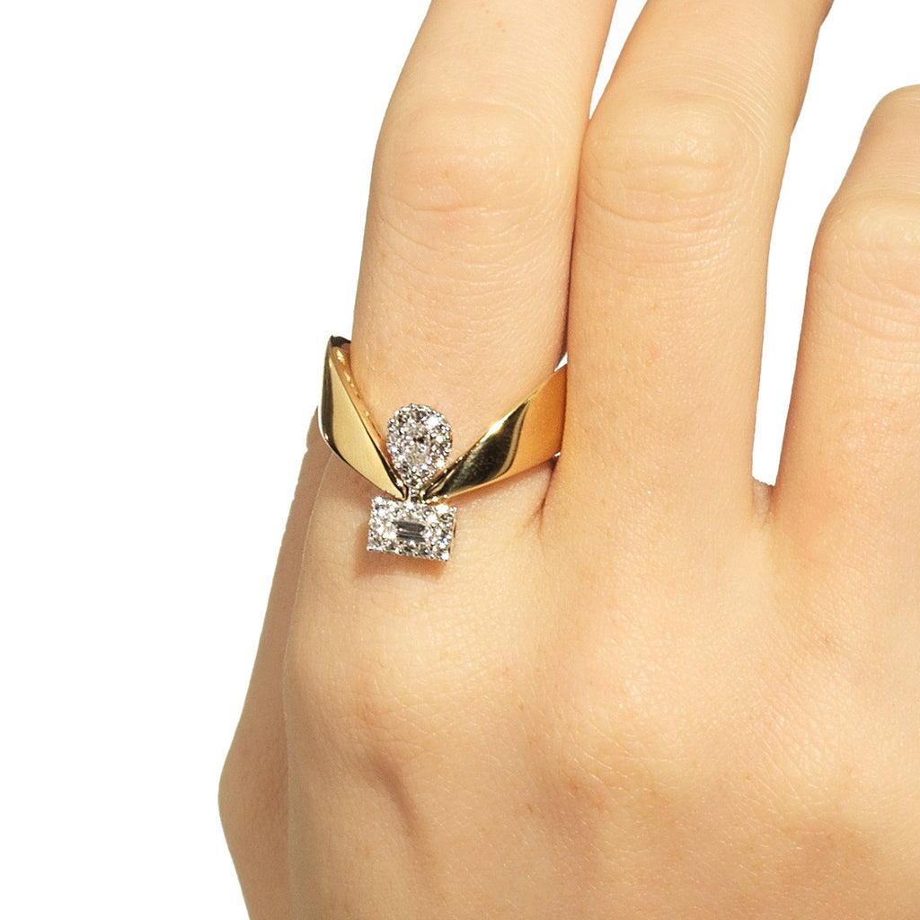 YEPREM stackable ring adorned with round, pear and baguette diamonds. These diamonds boast a remarkable clarity of VVS VS and F G color.