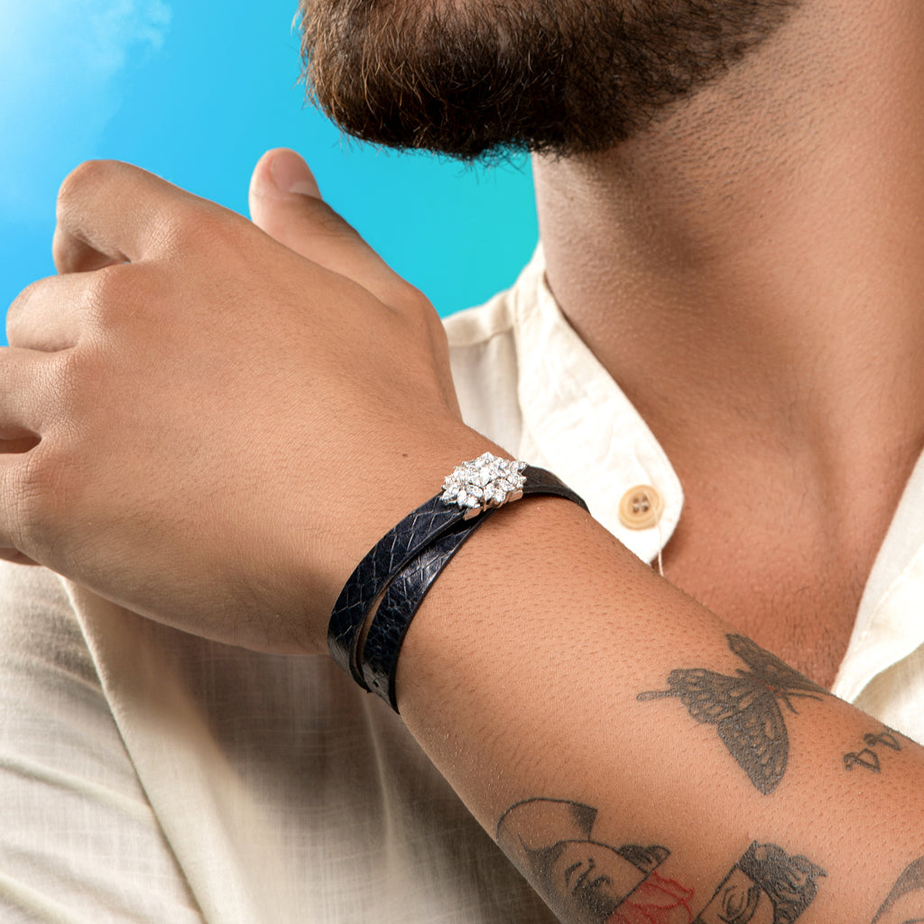 YEPREM double wrap leather bracelet adorned with a combination of round and marquise diamonds boasting exceptional clarity of VVS and VS, as well as a striking F-G color.