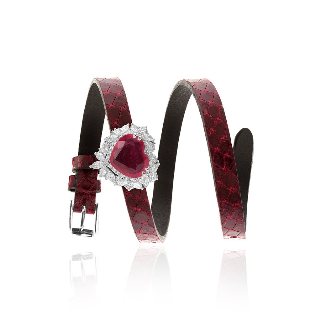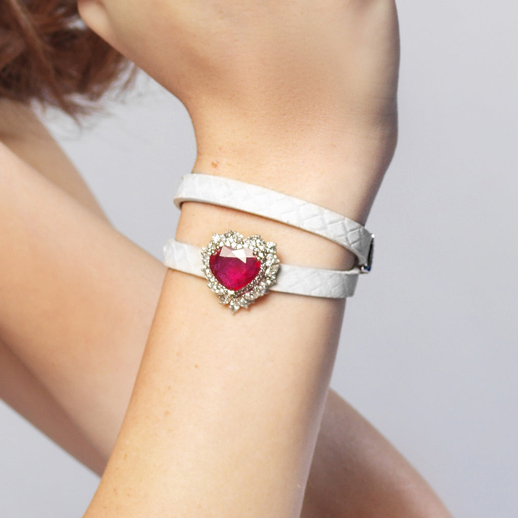 YEPREM double wrap leather bracelet adorned with a combination of round and marquise diamonds boasting exceptional clarity of VVS and VS, as well as a striking F-G color, perfectly accentuating the ruby centerpiece.