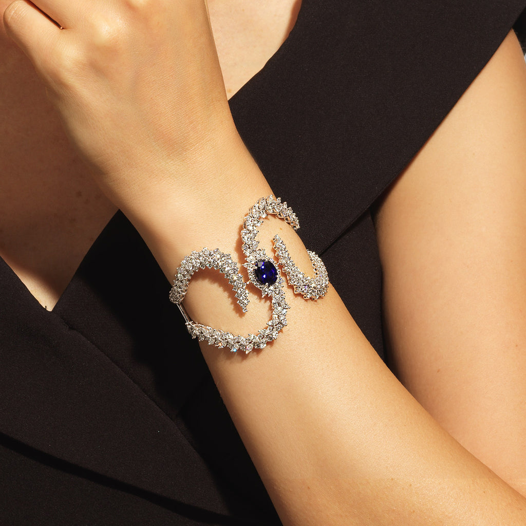 YEPREM bangle bracelet adorned with a combination of round and marquise diamonds boasting exceptional clarity of VVS and VS, as well as a striking F-G color, perfectly accentuating the sapphire.