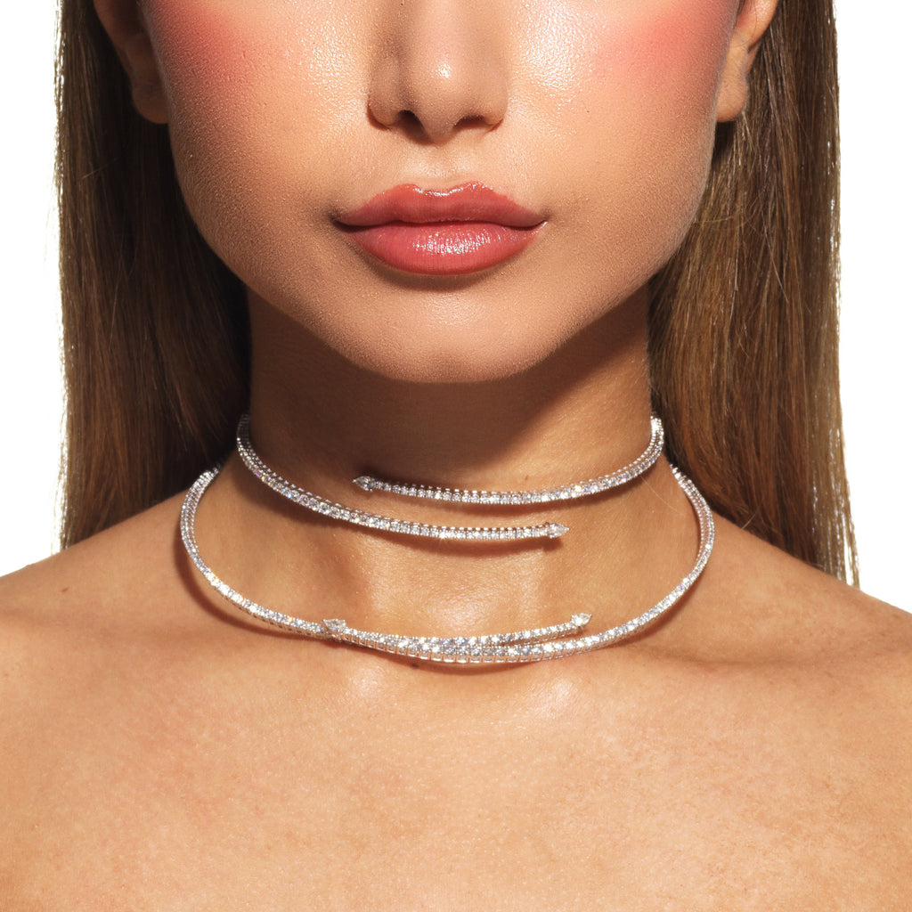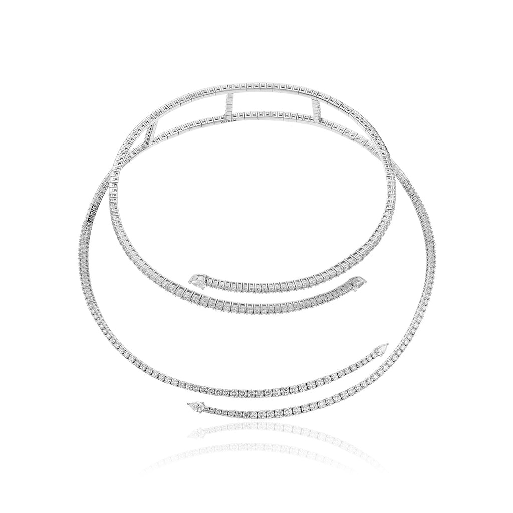 YEPREM statement necklace adorned with a combination of round and pear diamonds boasting exceptional clarity of VVS and VS, as well as a striking F-G color.