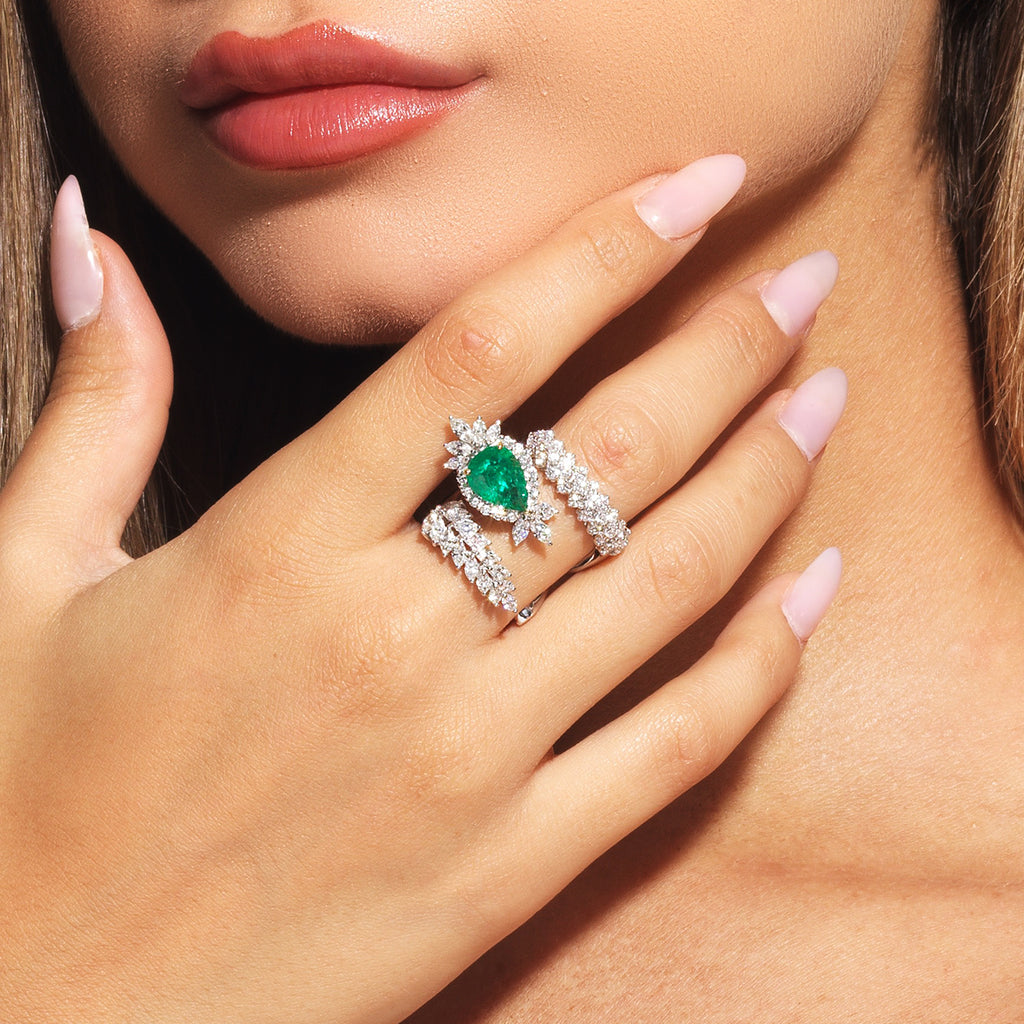 YEPREM stackable ring adorned with a combination of round and marquise diamonds boasting exceptional clarity of VVS and VS, as well as a striking F-G color, perfectly accentuating the emerald.